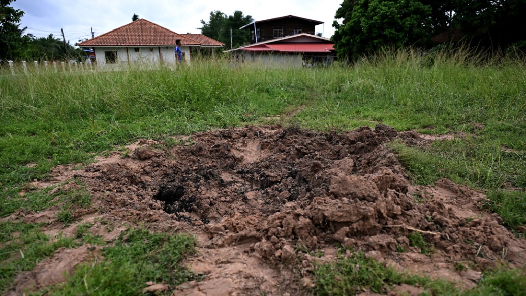 当地时间2025年7月26日,泰柬边境冲突进入第三天,一市场附近居民区惊现弹坑。视觉中国 图