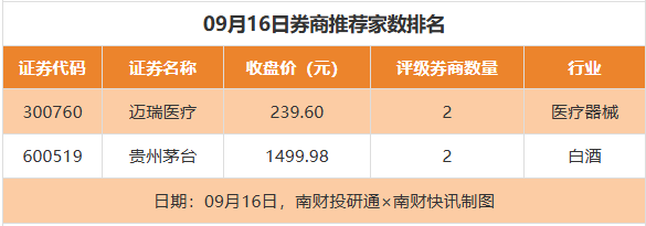 从券商推荐家数来看,9月16日有72家上市公司得到券商推荐,其中迈瑞医疗获得2家推荐,贵州茅台获得2家推荐,淮河能源获得1家推荐。