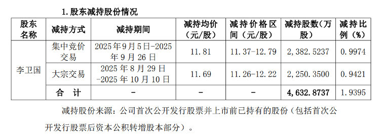 这份始于7月的减持计划,最终以远超市场预期的速度收官:仅用十余个交易日,李卫国便完成了4632.87万股的减持,占公司总股本的1.9395%,按公告披露的减持均价测算,李卫国本轮减持套现约5.44亿元。