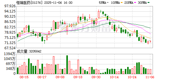 消息面上,10月27日晚间,恒瑞医药发布2025年三季报,前三季度实现营业收入231.88亿元,同比增长14.85%;净利润57.51亿元,同比增长24.5%。次日,股价直接跳空低开2.7个百分点,收盘跌5.06%。