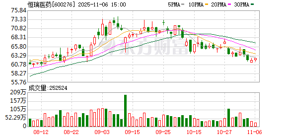 回购背后,《财中社》注意到,恒瑞医药股价已从9月份的最高74.04元,跌至11月5日收盘的61.96元,跌幅16.32%,最新市值4112亿元。