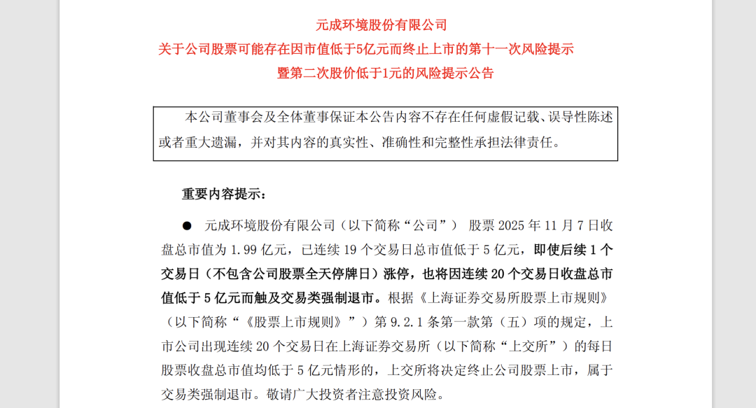 此外,*ST元成股价已连续10个交易日低于1元。即使后续10个交易日(不包含公司股票全天停牌日)连续涨停,也将因连续20个交易日收盘总市值低于5亿元而触及交易类强制退市。