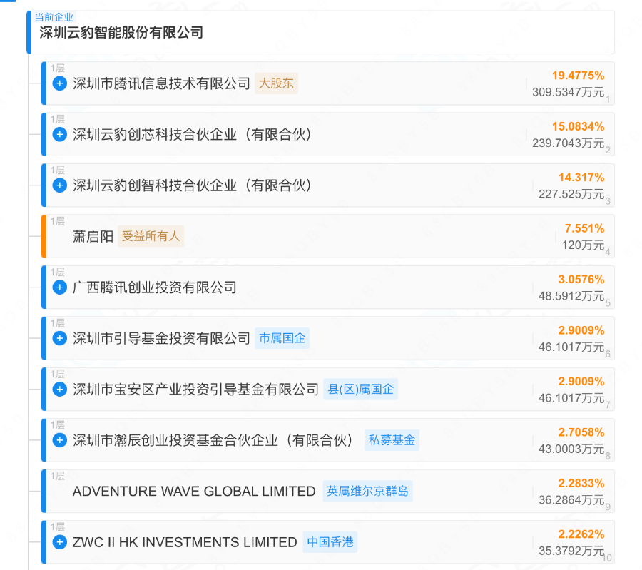 股权结构上,企查查信息显示,腾讯通过多次投资,合计持股比例为22.5351%,为公司最大股东,创始人萧启阳直接持股比例为7.551%。
