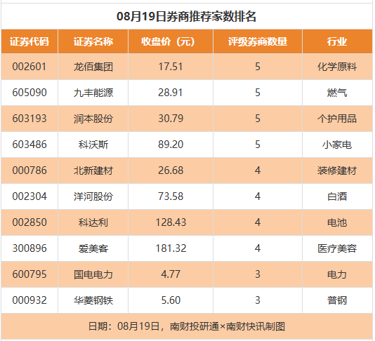 从券商推荐家数来看,8月19日有99家上市公司得到券商推荐,其中龙佰集团获得5家推荐,九丰能源获得5家推荐,润本股份获得5家推荐。