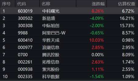 云计算ETF汇添富(159273)标的指数成分股涨跌互现:华胜天成涨停,中科曙光涨超8%,浪潮信息、拓维信息涨超2%,紫光股份涨超1%。下跌方面,新易盛跌超4%,中际旭创跌2%,科华数据跌超1%,阿里巴巴微跌。