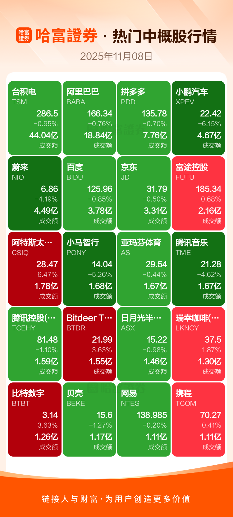 台积电跌0.95%,阿里巴巴跌0.76%,拼多多跌0.70%,小鹏汽车跌6.15%,蔚来跌4.19%,百度跌0.85%,京东跌0.50%,富途控股涨0.68%,阿特斯太阳能涨6.47%,小马智行跌5.26%。