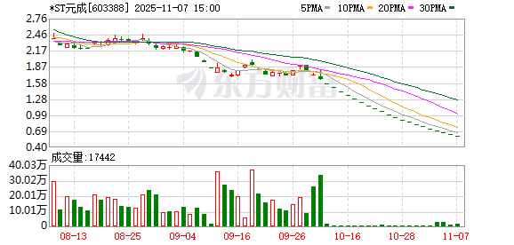此外,*ST元成股价已连续10个交易日低于1元。即使后续10个交易日(不包含公司股票全天停牌日)连续涨停,也将因连续20个交易日收盘总市值低于5亿元而触及交易类强制退市。