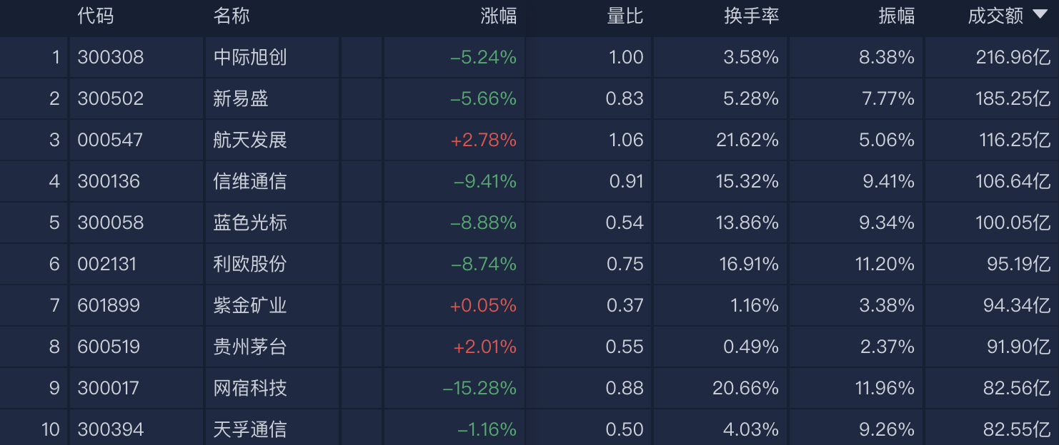 个股方面,中际旭创成交额超216亿元居首,新易盛、航天发展、信维通信等成交额靠前。