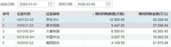 在2026年以来的回购热潮中,不同上市公司的回购力度差异明显,其中不乏回购数量突破千万股的企业。Wind数据显示,截至3月5日,今年以来有25家公司回购数量超过1000万股,其中京东方A、顺发恒能、大秦铁路三家公司位居回购数量前三甲,回购数量均大幅领先于其他企业,彰显出行业龙头企业在回购潮中的引领作用,也体现出这类企业对自身发展的坚定信心和雄厚的资金实力。
