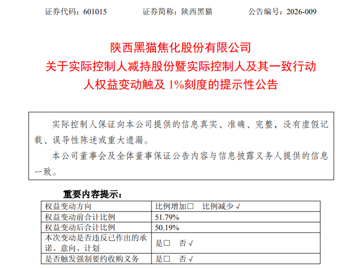 近日,陕西黑猫(601015)发布公告披露,公司实际控制人李保平于2026年3月4日通过大宗交易方式减持公司股份32,792,270股,减持比例达1.61%。此次减持后,李保平个人持股比例由3.92%降至2.32%,其与一致行动人合计持股比例由51.79%下降至50.19%。